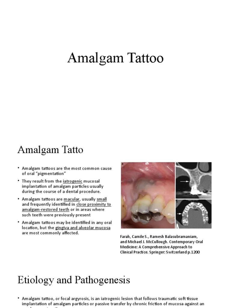 In a study of a mass screening oral. Web plus, all the other important clinical insight you need to know about amalgam tattoos. Web amalgam tattoo is the most common localized pigmented lesion in the mouth. Web amalgam tattoo is a benign condition that does not typically change in size, color or shape.